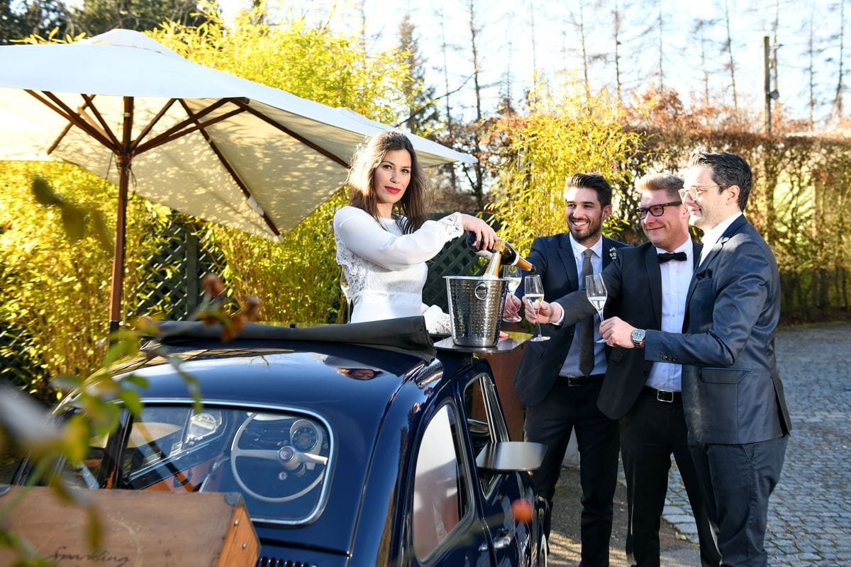 Da ich Oldtimer liebe und kleine Autos sowieso (mein erstes Auto war ein alter Mini), war ich sofort schockverliebt in das Sparkling Car von Marion Schindlbeck. Sie hatte eine wunderbare Idee und bietet den kleinen Fiat 500 als mobile Bar für Hochzeiten und andere Events an.